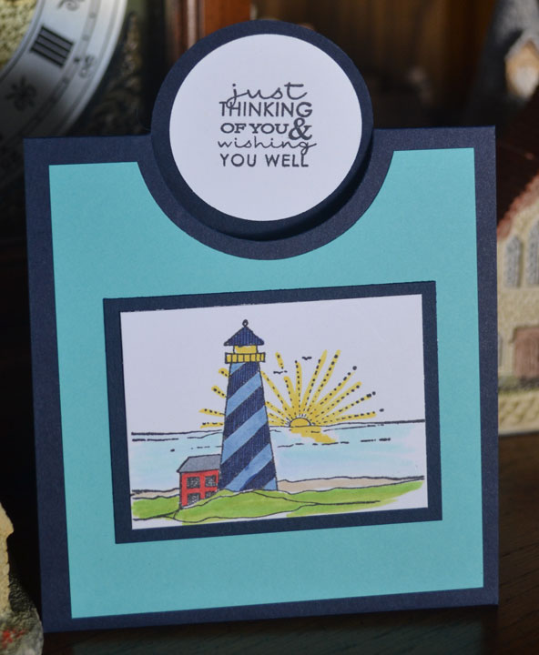When I was coloring over the winter I had fun doing this lighthouse, doesn't it look like somewhere you'd like to be on a sunny morning? I again used one of the card bases from Cut Cardstock, used a punch for my sentiment and mounted the image onto a dark blue scrap piece I had in my stash. Another card made and many more images to do. Fun times ahead.
